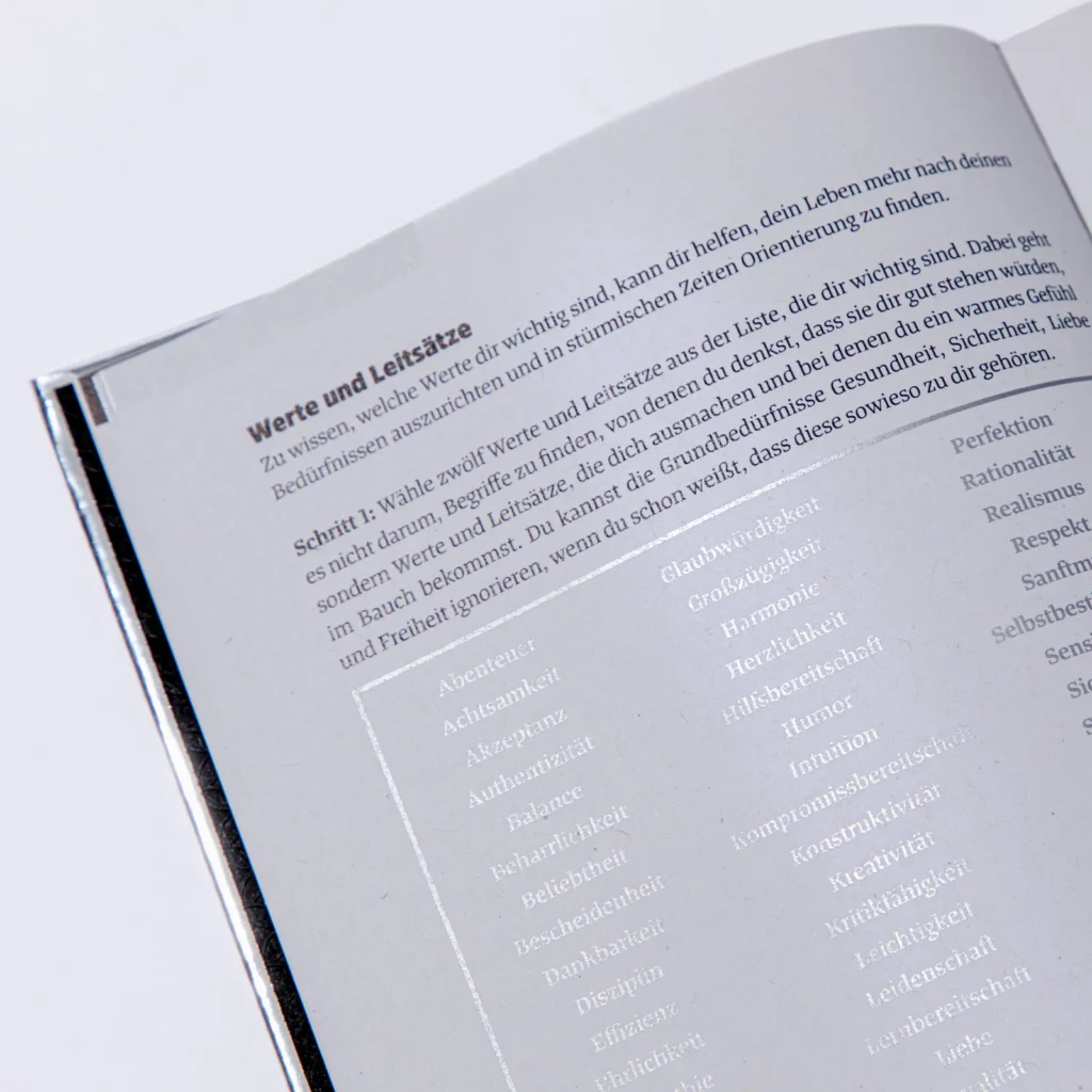Die Akzentfarbe im Planer, die in den Anfangsjahren Grün und heute in edlem Beige gehalten ist, glänzt hier in feierlichem Silber. Seite um Seite lädt sie zum Reflektieren ein.