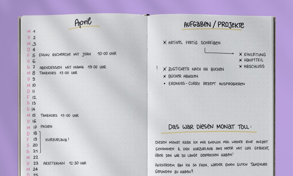 Tipp: Es kann sein, dass du deine Termine lieber mit einem digitalen Kalender (Smartphone, Laptop) planst. Zwinge dich nicht, etwas zu ändern, was bereits gut für dich funktioniert. Ein Bullet-Planer soll dein Leben vereinfachen und funktioniert auch gut in Kombination mit anderen Organisationstools.