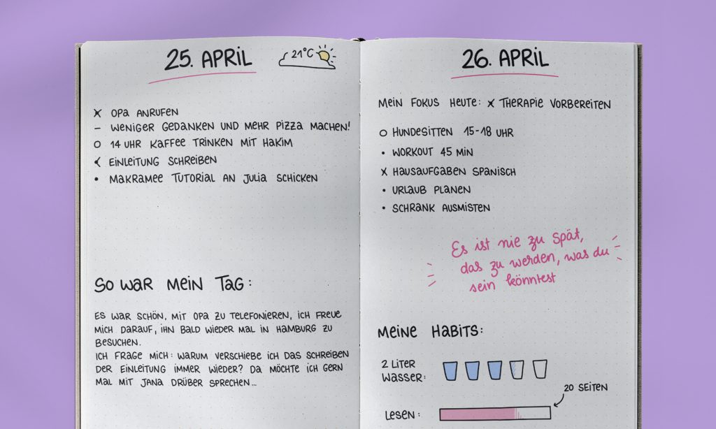 Tipp: Sieh den Bullet-Planer nicht nur als ein produktivitätsförderndes Notizbuch, sondern auch als Werkzeug für mehr Selbstfürsorge an. Indem du dir Zeit nimmst, dein Journal noch mal in Ruhe durchzublättern und deine Einträge zu reflektieren, erlaubst du dir, dich mit dir selbst zu beschäftigen. Und das flexible System lässt dich den Fokus immer auf das legen, was du gerade im Leben brauchst.