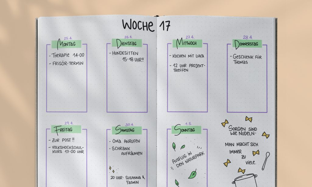 Die Wochenplanung verschafft dir einen schnellen Überblick darüber, welche Aufgaben, Verabredungen und Co. in der Woche anstehen. Diese Ansicht ist zwar nicht im Original-System enthalten, ist unter Bullet-Planer*innen aber mittlerweile zu einem echten Standard geworden.