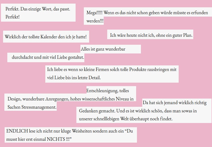 - Plagiate ließen nicht lange auf sich warten. Aus über 30 anderen Kalendern kann man sich heute quasi Ein guter Plan selbst zusammenbasteln, jede unserer Techniken hat es inzwischen in andere Planer geschafft. Plötzlich gab es unzählige Kalender mit Achtsamkeitsampeln, Monatsreflexionen, Habit-Trackern und wöchentlichen Achtsamkeitstipps. Unsere Slogans wie „Das Buch, das dein Leben verändert“ oder „Das wichtigste Buch in deinem Leben sollte über dein Leben sein“ fanden sich plötzlich 1:1 auf den Websites anderer Produzent*innen. Sogar Texte und Tipps wurden exakt übernommen, unsere Wochenansicht genau nachgebaut. Plötzlich waren viele Kalender „gegen die Glorifizierung von Stress“, „für mehr Achtsamkeit und Selbstliebe“, „gegen Selbstoptimierung“. Sogar die Texte aus unseren Crowdfunding-Videos wurden 1:1 nachgesprochen, unser Preisstruktur samt Rabatten auf den Cent genau übernommen, Influencer*innen mit denen wir arbeiten, schreiben uns nach Postings über Ein guter Plan genervt, dass sie sofort zehn Anfragen von Kopien bekommen haben. Unser Coverdesign wird übernommen und bei Beschwerden gibt es die lapidare Antwort, dass Bücher nun mal so aussehen und man sie ja gar nicht anders gestalten kann. Sogar unsere AGBs werden kopiert. Dumm, wenn man dann vergisst, unsere E-Mail-Adresse rauszunehmen …