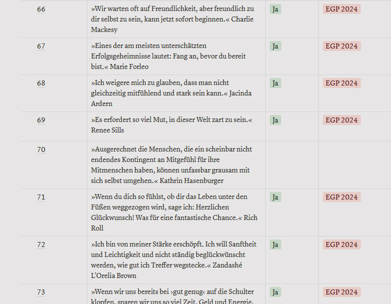 Das Sammeln der letzten Monate hat 80 Zitate ergeben, welche wir im Team nun bewertet haben. Es sind 50 übrig geblieben. Die fehlenden 6 zu finden, wird mich noch einige Tage kosten. Aber es wird.