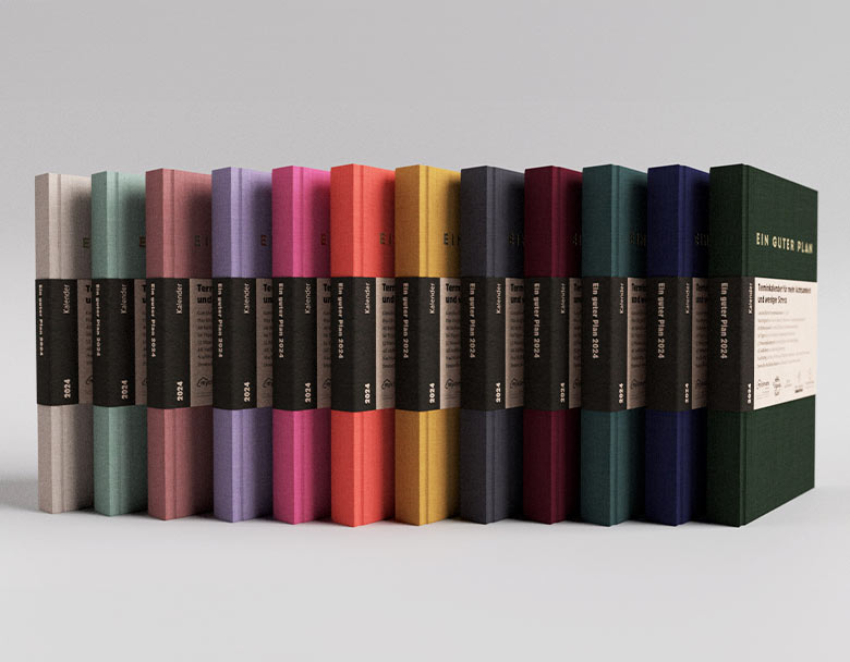 Ein schönes Beispiel, was kleine Ideen für einen großen Prozess nach sich ziehen können: Ein guter Plan hat bekanntermaßen nur das Logo auf die Vorderseite geprägt. Der Rest erstrahlt in nacktem Leinen. Kein Barcode, keine Infos, nüscht. Es ist also von außen nicht erkennbar, um welchen Ein guter Plan es sich handelt. Das ist im Alltag okay, man hat schließlich meist nur das aktuelle Jahr im Gebrauch.