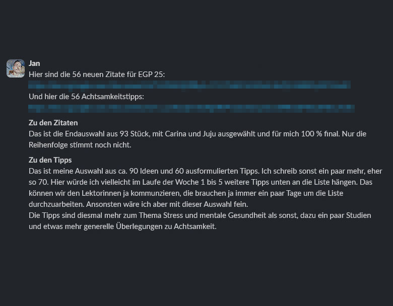Ich habe jetzt neun Wochen Zeit, alle Inhalte zusammenzubekommen. Das ist enorm aufwendig, denn wir recyceln weder Zitate noch Tipps. Unsere Ratschläge für mehr Achtsamkeit sind nicht lang; 920 Zeichen. Aber 56 Themen zu finden, zu recherchieren und auf wenige Sätze zu kürzen, ist wirklich viel Arbeit. Dabei muss ich berücksichtigen, was Stammkund*innen schon lange, Neukund*innen vielleicht aber noch nicht über Achtsamkeit wissen. Neben den Grundlagen müssen auch neue Erkenntnisse aus der Psychologie ihren Platz im Planer finden. Oft arbeite ich viele Stunden an einem einzigen Tipp.