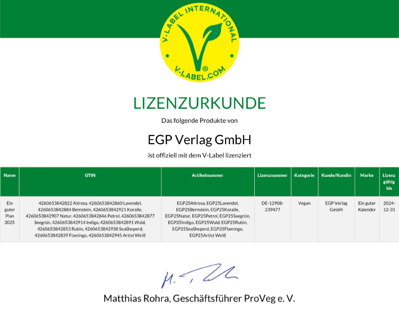 Das Highlight diesen Monat ist die Zertifizierung von Ein guter Plan mit dem V-Label. Fünf Jahre haben wir daran gearbeitet, alle Materialien tierischen Ursprungs zu verbannen, auf neue Leime umzustellen und alle zuliefernden Unternehmen eine Garantie abzuringen, dass sie an keiner Stelle tierische Stoffe einsetzen. Das war enorm viel Aufwand. Viel mehr, als man denken würde. Unzählige Telefonate, monatelange Recherchen, hohe Kosten und sogar der ganze Umbau von Maschinentrassen waren nötig. Aber nun ist es geschafft.