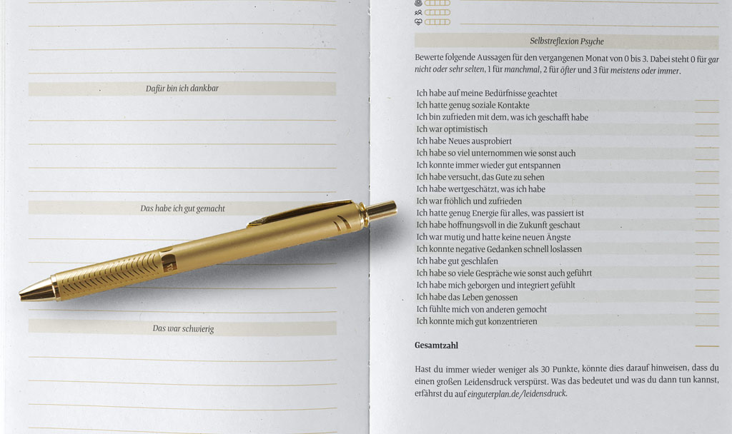 Vielleicht hast du dir klarere Empfehlungen gewünscht, aber mentale Gesundheit ist extrem komplex. Nur weil du in der Selbstreflexion auf unter 30 Punkte gekommen bist, bedeutet das nicht, dass du eine Therapie brauchst. Beobachte die Werte ruhig über mehrere Monate und vertraue auf dein Bauchgefühl: Denkst du, dass sich dein Leben demnächst wieder verbessern wird? Oder machst du dir etwas vor und ahnst eigentlich, dass tieferliegende Probleme der Grund für deinen Schmerz sind? Reicht wirklich ein kleiner Urlaub, damit es dir wieder nachhaltig besser geht oder wird es Zeit, sich langfristig um deine Psyche zu kümmern? Sei da bitte ehrlich mit dir, aber mach dich auch nicht jeden Monat verrückt mit der Zahl aus der Selbstreflexion. Ausschlaggebend ist ganz allein dein wahrgenommener Leidensdruck und deine Einschätzung, wie gut du ihn mit eigenen Mitteln reduzieren kannst. Punktezahlen spielen eine untergeordnete Rolle. Wir wollen mit dem Test nur einen ersten Anhaltspunkt geben, Menschen auf die Möglichkeiten hinzuweisen. Für viele ist es völlig klar, dass sie sich Hilfe suchen, wenn es ihnen schlecht geht, aber es gibt auch sehr viele Menschen, die verständlicherweise eine große Berührungsangst bei der Thematik haben. Dass wir uns als Herausgeber*innen von Terminkalendern herausnehmen, diese Menschen auf mögliche Probleme hinzuweisen, ist vielleicht weit über unseren Kompetenzen und sicher weit mehr als das, was man von einem Terminkalender erwartet. Aber wir haben uns mit unserem Verlag auf die Fahne geschrieben, für Aufklärung in diesem Bereich zu sorgen und gegen das Tabu von mentalen Problemen zu kämpfen. Achtsamkeit ist schön und gut, oft reicht sie aber einfach nicht.