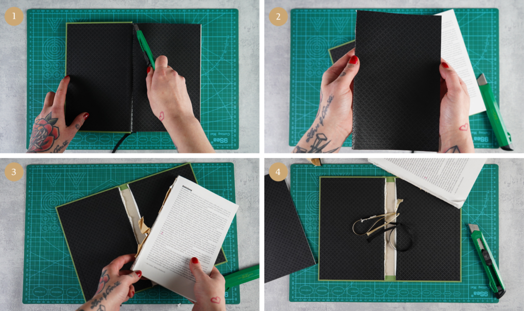 (1) Zuerst entfernst du mit einem Cuttermesser wie auch beim Recycling den Buchblock vom Umschlag. Wenn du mit dem Abtrennen beginnst, merkst du von ganz alleine, wo du sauber schneiden kannst, damit er sich löst.