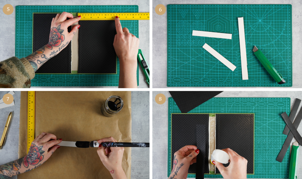 (5-6) Jetzt schneiden wir aus (alter) Pappe die drei Seitenwände in Länge der Buchseiten zu: zwei kurze (14x2cm) und ein langer Streifen (22,5x2cm). Nimm dafür einen Karton deiner Wahl. Er sollte nur nicht zu dünn sein, damit die Schatulle auch stabil wird.