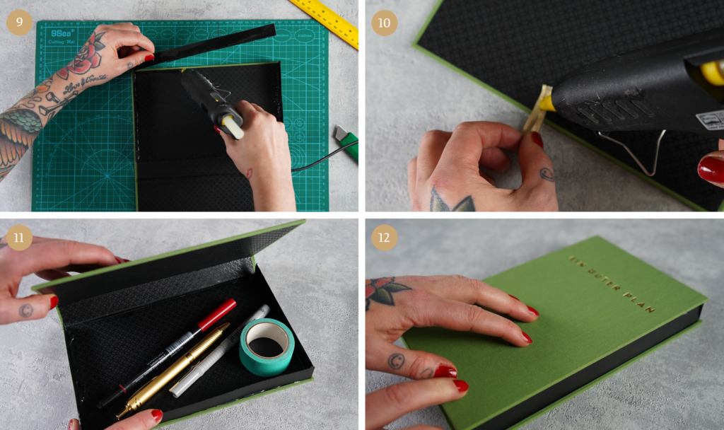 (10) Optional: Für einfaches Öffnen kannst du eines der Lesebändchen als Schlaufe an der Unterseite des Deckels befestigen. Ist dein Ein guter Plan sehr schmutzig, kannst du den Leinen auch wunderbar bemalen. Wasserfeste Marker, Acryl- und Wasserfarben: Das alles hält perfekt auf dem Umschlag, nicht ohne Grund sind die meisten Gemälde auf Leinen gemalt.